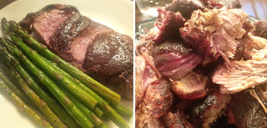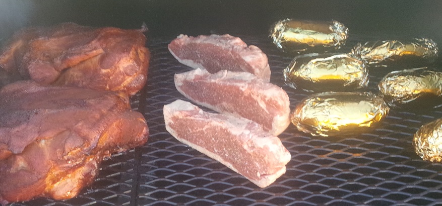 After the steaks reached an IT of 110, seared them off to a med rare and served with a pile of asparagus. The potato was so big it required a second plate. Chunked the pork butts for a Saturday family gathering.