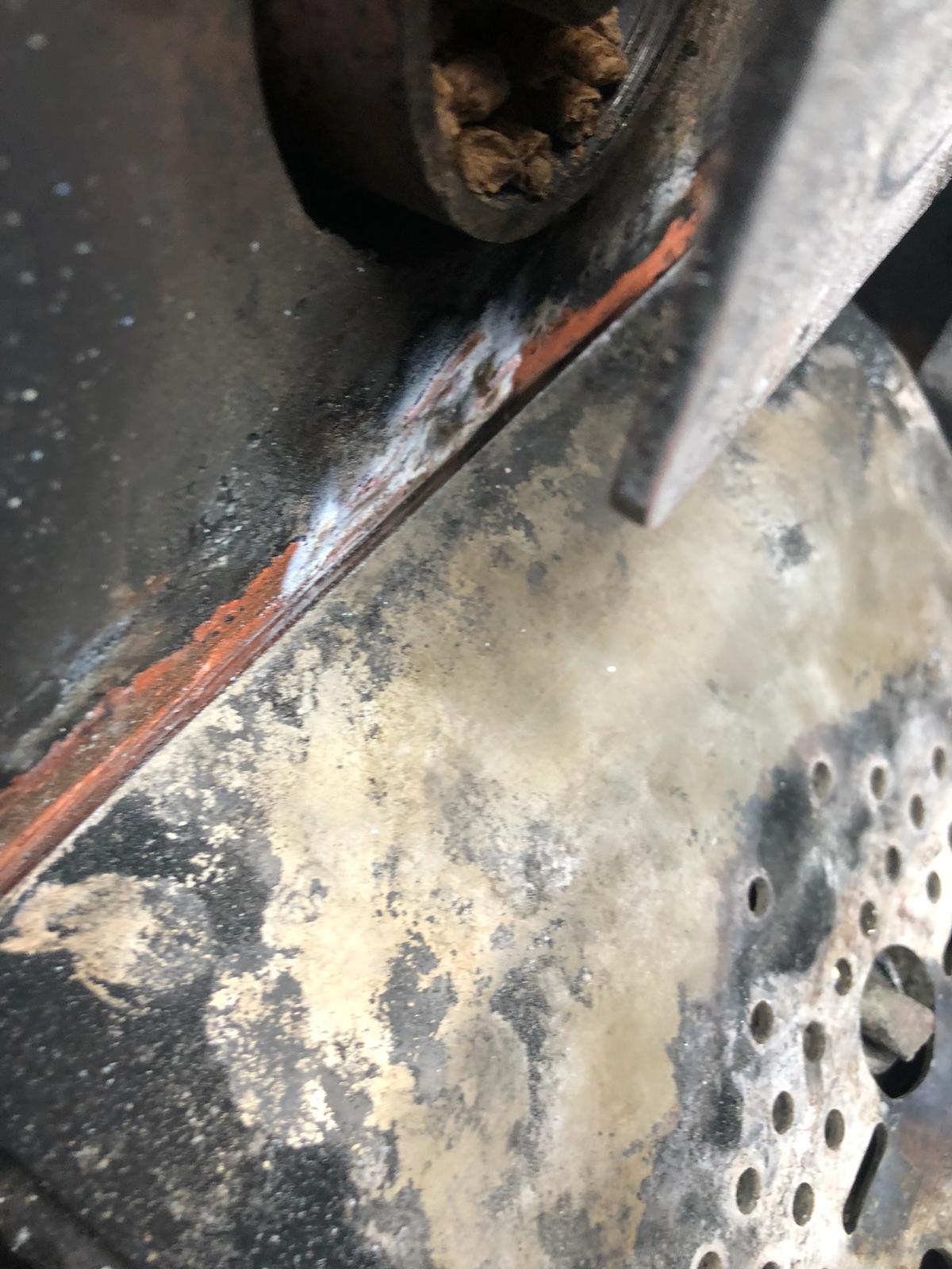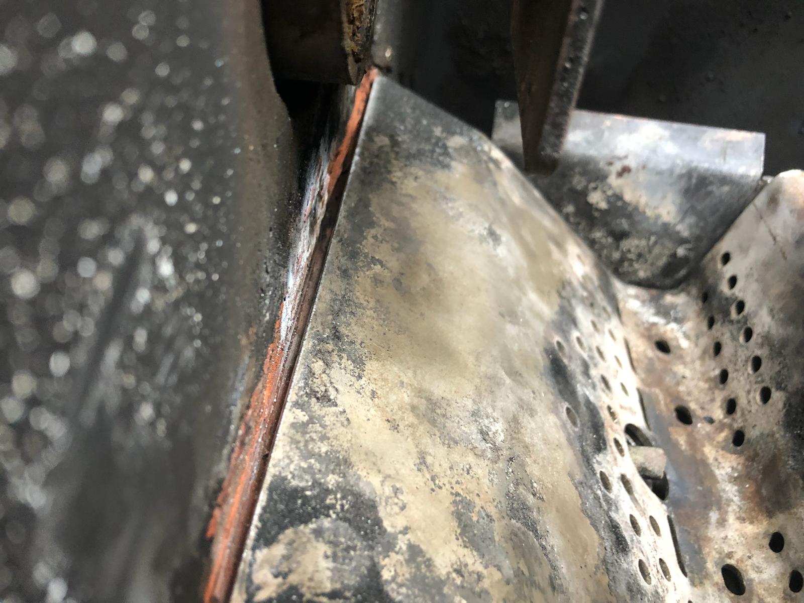 Theres black sealant around the firebox. Above the firebox is the orange sealant. It is cracker after two cookes.