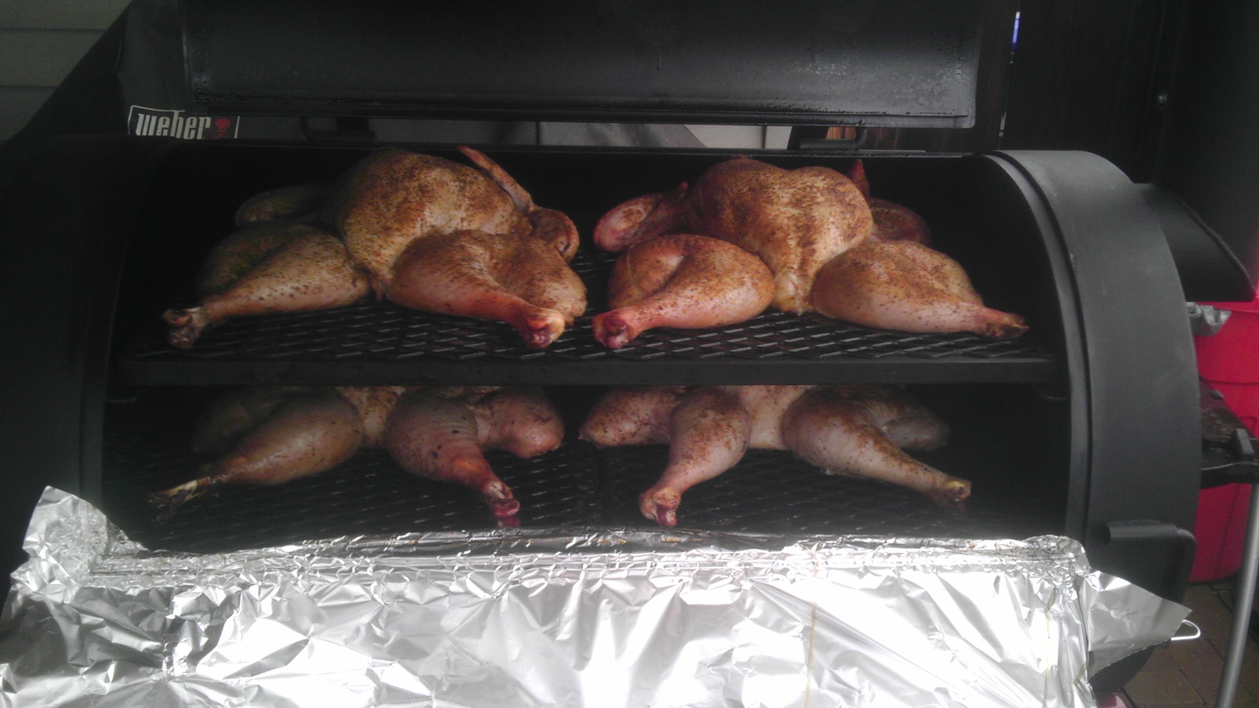 Do you cook them on the lower shelf or upper shelf at that temp Herb? I'm finding the radiated heat off the diffuser at those temps tends to burn the bottoms of some things for me if I use the lower shelf. The birds were each between 5 and 6 lbs and ended up cooking for about 3.5 hours at 250F set temp on 640. I have it extremely well insulated and only opened it once during cooking... I was worried that they wouldn't be done in time and had built in 4 hours. Turned out just fine. Thanks for the swag guess--you were pretty darned close on the lower end of the range. I let them sit in foil for about an hour too before cutting them into more manageable pieces and they were nicely smoked and very moist.