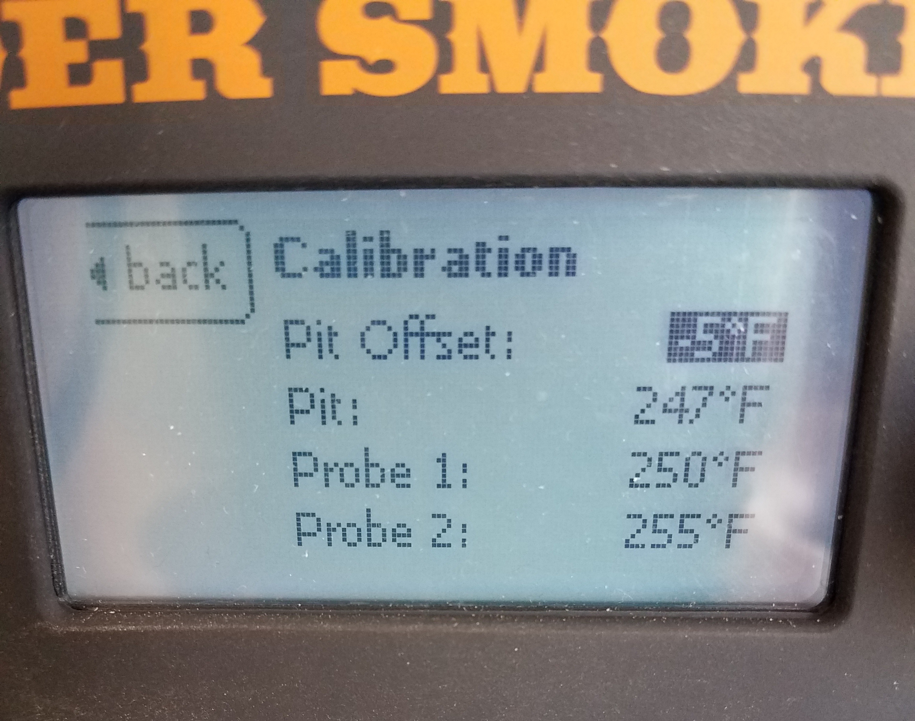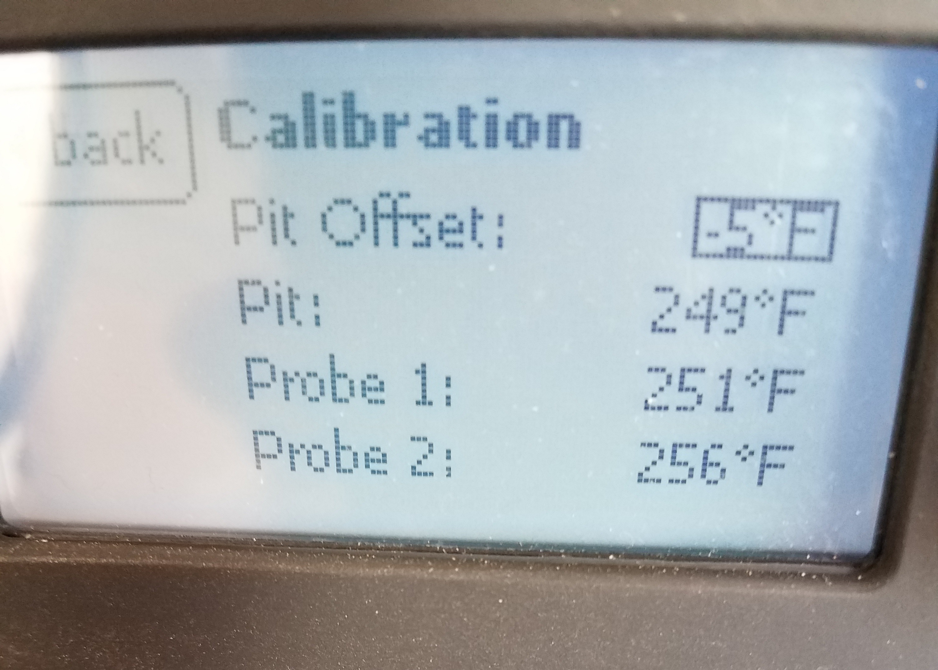 At about the one hour mark, the grate probes had been reading lower than the cooker thermocouple, so I set the calibration to a -5 (minus five) to tell the controller that the physical grate temperatures had been reading an average of 5 degrees lower that the display. I set the -5 by pushing in on the dial to select the change, and then turning the dial counter clockwise.