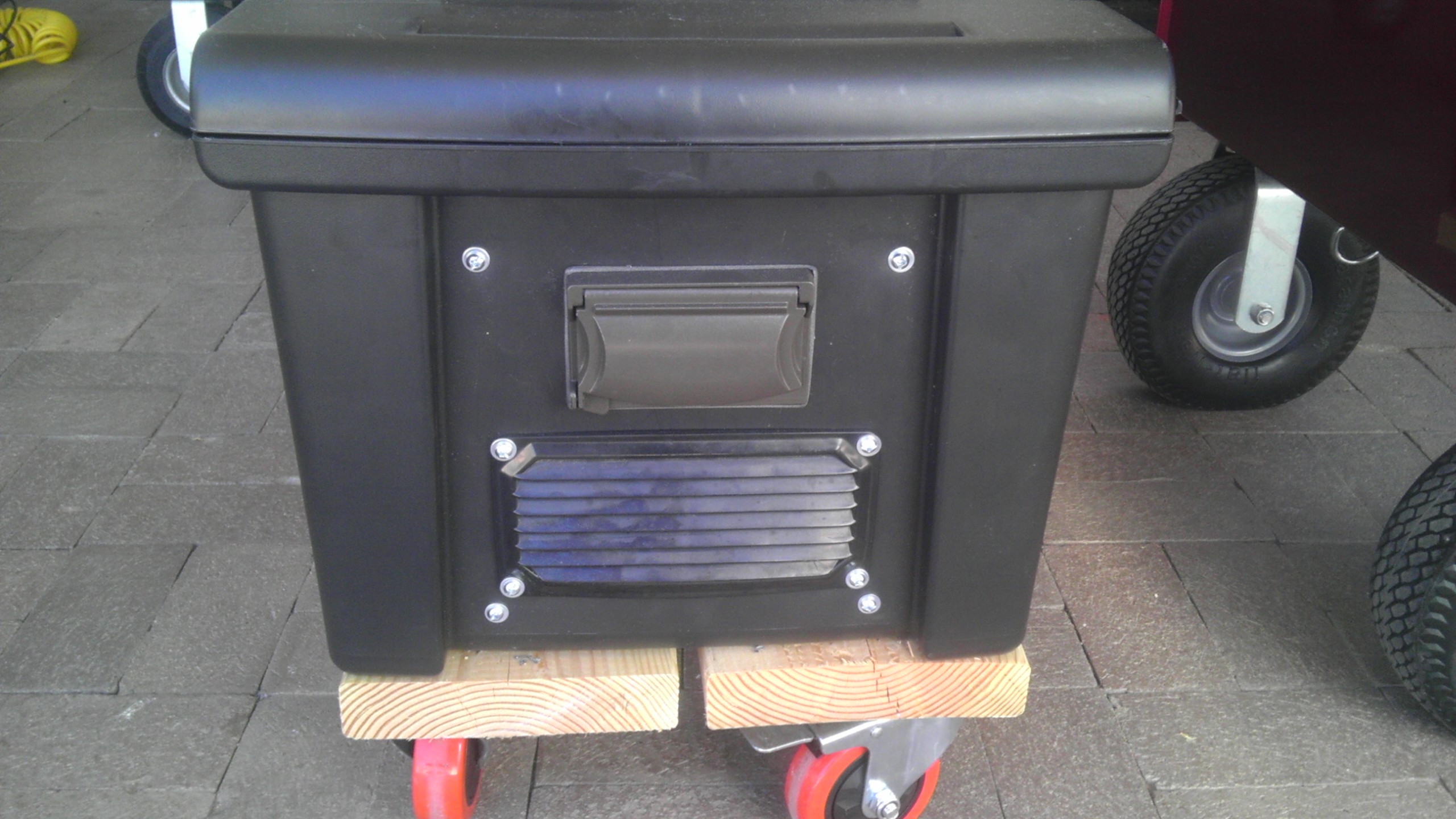 Here are pictures of the portable power box I made to run a YS1500 and a YS640 at BBQ Comps. This will run both cookers for an entire comp, and probably the entire weekend if needed. We also have run LED lights and an electric knife with no issues. Batteries are type 27 deep cycle and wired in parallel. The 12vdc inverter is wired by attaching the positive lead to one battery and the negative lead to the other battery. This allows the inverter to drain power from both batteries as though they were one big battery. The 12vdc charger is wired the same as the inverter.