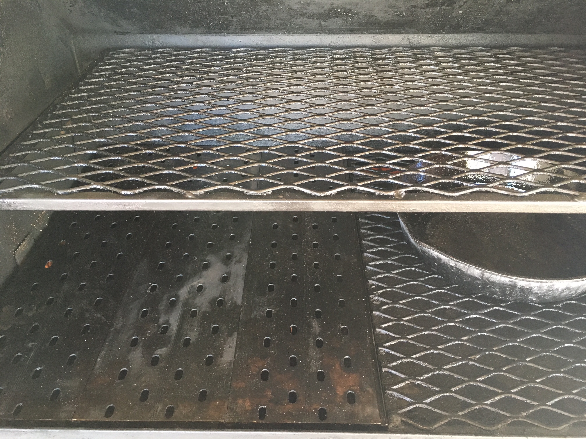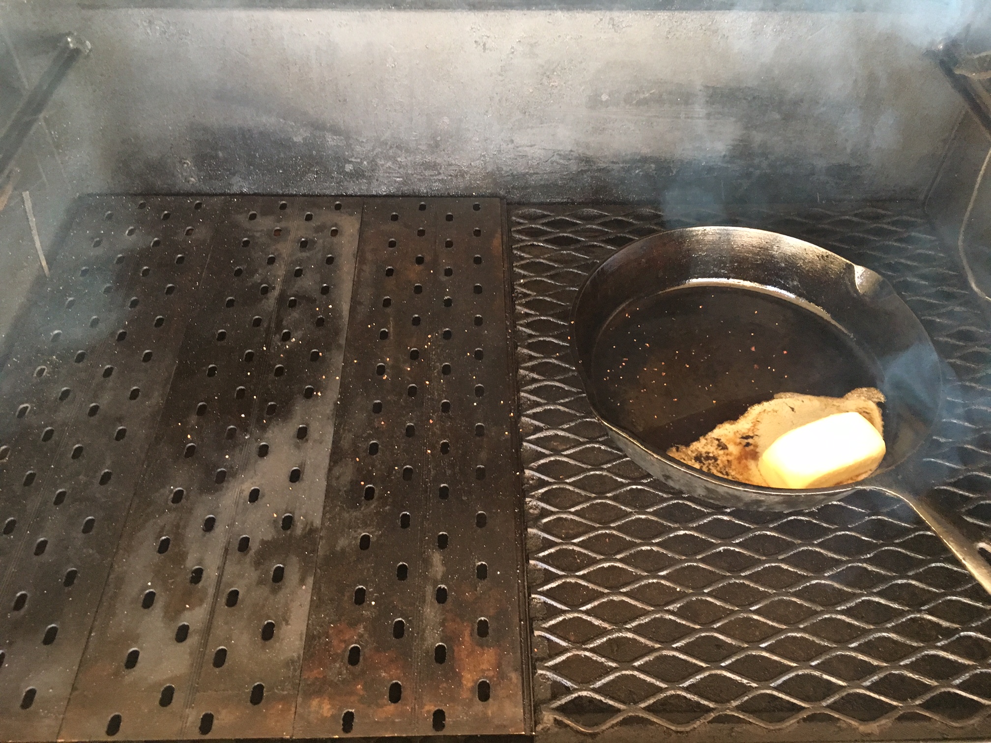 Here is how the YS640 was setup, top grate in, optional grill grate kit on the left, flat side up, 2 piece diffuser with the door installed in place in the cooker, cast iron pan on the right to preheat for seasoned onions and mushrooms: