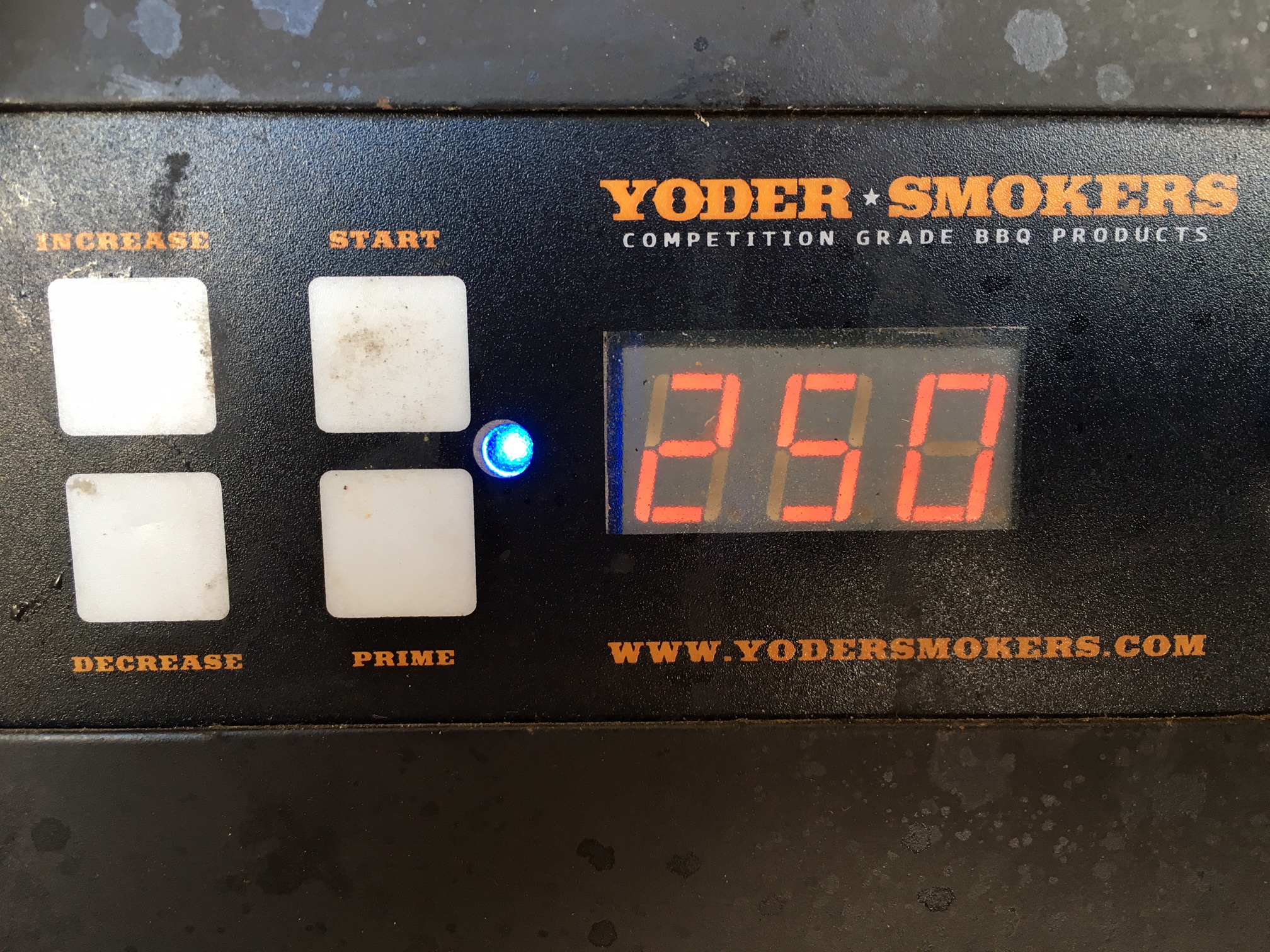 I first cleaned all of the ash from the burn grate and the firepot, plugged the cooker into power, flipped the switch to the ON position and left the default temperature setting of 350 degrees. While I waited for the fire to start, I removed the left hand grate (or grates if you have the round bar grates), and replaced it with the optional 3 piece grill grate kit, flat side up. I then put in the upper shelf. After the fire started, I closed the lid and walked away from the cooker for about 30 minutes. When I checked in on the cooker, it was still in the cool down mode from the overshoot, so I set my desired cooking temperature of 250 and walked away to prep the meat for this experiment.